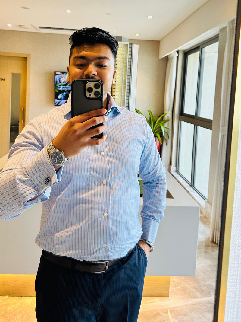 The subtle twill weave lends quiet depth to the elegant lavender tone, while the French cuffs complete its unmistakably formal character. With its 200s yarn count, this shirt is not only a marker of luxury but also a statement of discernment — reserved for those who understand true rarity. Crafted using advanced Siro-spun technology for superior smoothness, durability, and a silk-like finish.