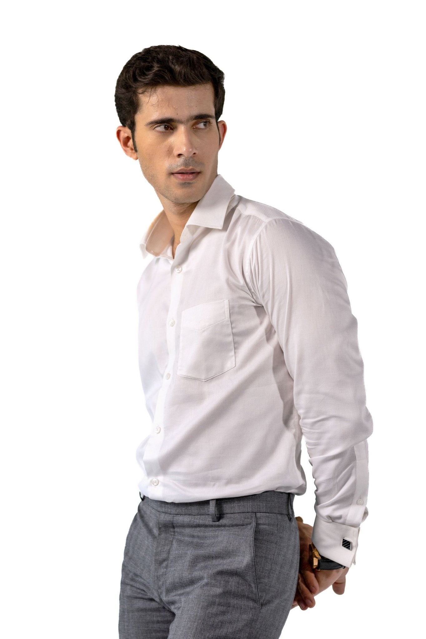 Step into understated elegance with this pristine white shirt from Greyed’s Boardroom Collection. Crafted from superfine long-staple 100% cotton, it features a subtle herringbone weave that adds depth and a quiet sheen to the fabric.
