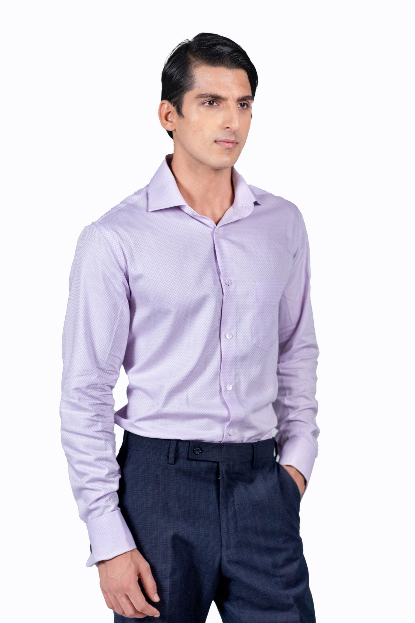 Bring subtle pattern and polished colour to your formal wardrobe with Greyed’s Lavender Checker Dobby Shirt, part of the Boardroom Collection. Woven with superfine cotton in a refined dobby checker weave, this shirt offers gentle texture and a soft sheen that stands out without being loud.