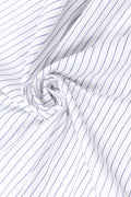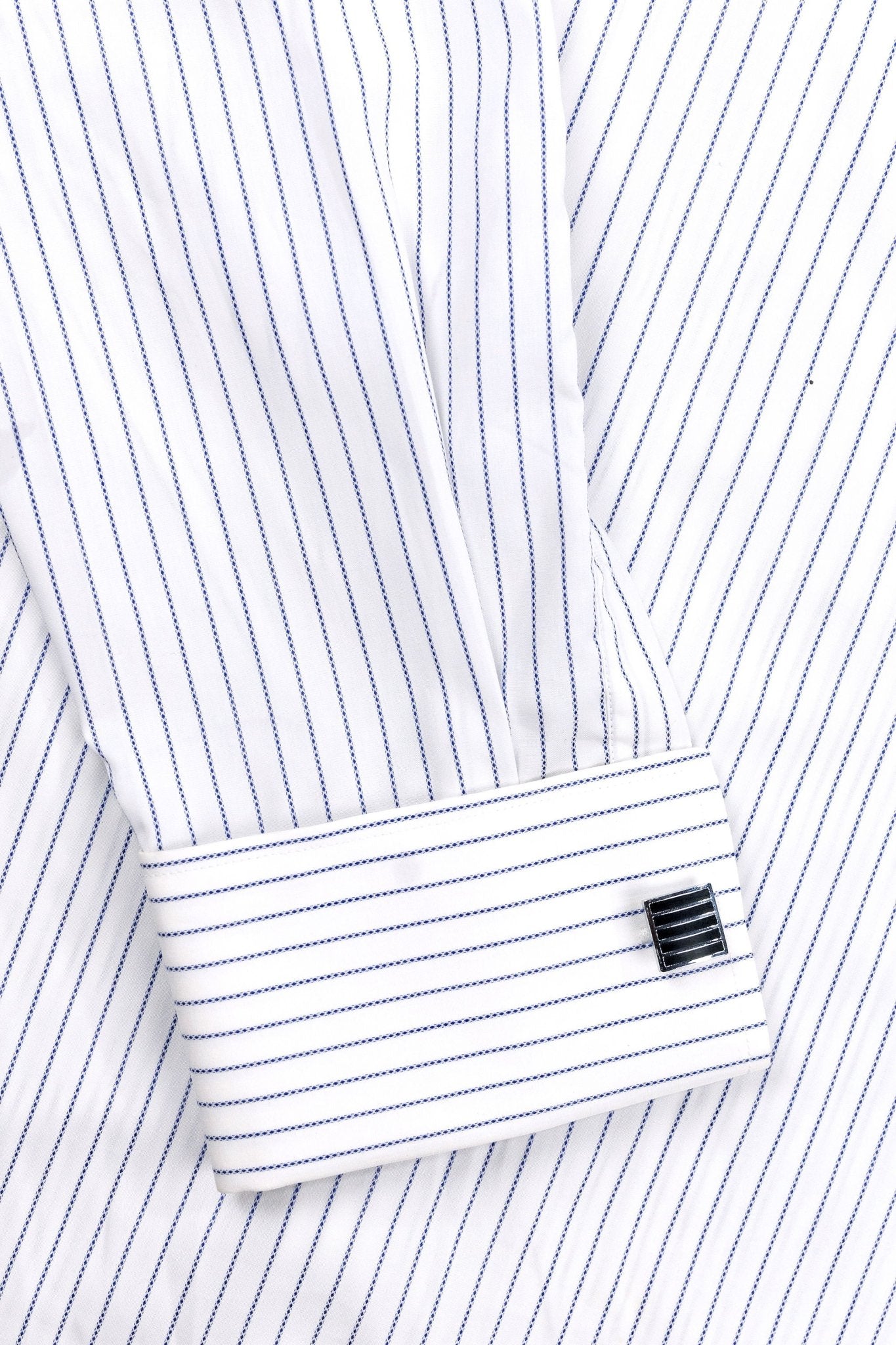 The slender blue stripes on a white base strike the perfect balance between formality and elegance, offering a distinguished alternative to solid shirts. Paired with French cuffs, this shirt is designed for men who navigate the boardroom with quiet confidence and poise.
